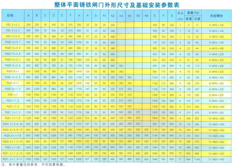 整體平面鑄鐵閘門外形尺寸及基礎(chǔ)參數(shù)表